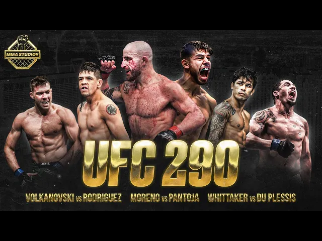 UFC 290: Volkanovski vs. Rodríguez was a mixed martial arts event produced by the Ultimate Fighting Championship that took place on July 8, 2023, at the T-Mobile Arena facility in Paradise, Nevada, part of the Las Vegas Metropolitan Area, United States. A UFC Featherweight Championship unification bout between current champion Alexander Volkanovski and interim champion (also The Ultimate Fighter: Latin America featherweight winner) Yair Rodríguez headlined the event. UFC 290 PPV Main Event On ESPN+: 145 lbs.: Featherweight champion Alexander Volkanovski vs. Yair Rodriguez UFC 290 PPV Co-Main Event On ESPN+: 125 lbs.: Flyweight champion Brandon Moreno vs. Alexandre Pantoja UFC 290 PPV Main Card On ESPN+ (10 p.m. ET): 185 lbs.: Robert Whittaker vs. Dricus Du Plessis 155 lbs.: Dan Hooker vs. Jalin Turner 185 lbs.: Bo Nickal vs. Valentine Woodburn (Tresean Gore injured)