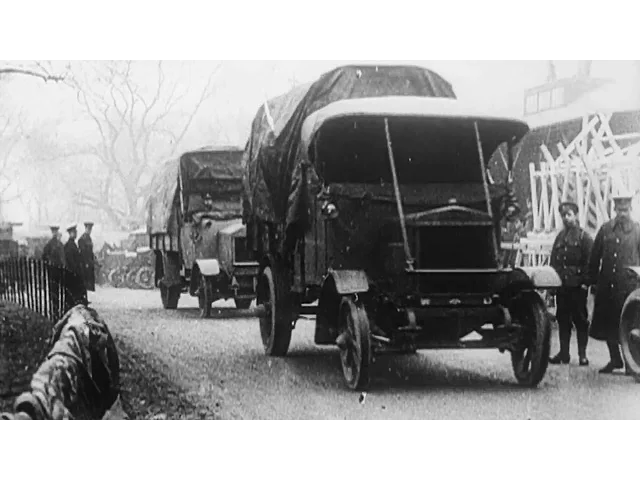 Tommy's Christmas parcels are despatched to the Front in a fleet of trucks.