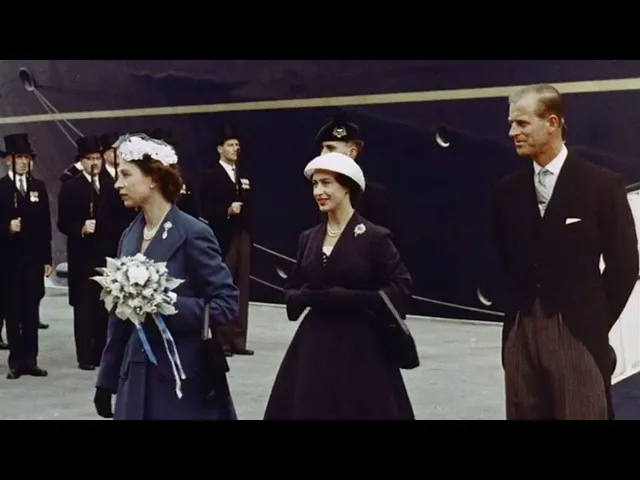 Colourful commemoration of Royal Yacht Britannia's majestic visit to Leith in 1956, courtesy of Messrs Joseph and J Arthur Rank.