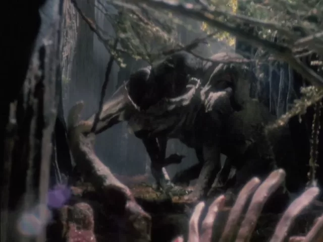 In a dense forest, a monoceratops-type plant-eating dinosaur is stalked by a carnivorous Tyrannosaurus rex.