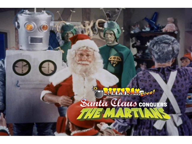 The nasty Martian villain Voldar (his face is coated in green oil and he has a huge mustache, therefore he’s evil) captures two Earth children, Billy and Betty, who don’t hold out for even a minute but rat out our fattest, jolliest elf without a struggle. Voldar takes Santa and the children prisoner and heads off for Mars. Only the bravery of Billy and Betty and the bumbling of a stowaway and “the laziest man on Mars”, Droppo, can foil Voldar’s evil plans! Throw into the mix Santa and the Fairy Snow Queen, an insane short featuring a pixie named Snoopy, a horrific life size Jack in the Box, and a lion who is oh so proud of his candy eating ability, and you’ve got one of our funniest live shows to date. Please join Mike, Kevin, and Bill for RiffTrax Live: Santa Claus Conquers the Martians!
